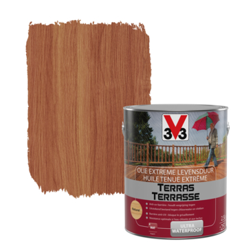 De V33 terrasolie met extreme levensduur is heel waterproof en voedt het hout in de diepte. Deze olie is uitermate geschikt voor houten vloeren die onderhevig zijn aan invloeden van buitenaf. Bovendien is de olie, sneldrogend, reukarm en verrijkt met was, voor een betere weerstand tegen vet en vlekken. Deze olie met matte afwerking kan gebruikt worden op terrassen, tuintegels, etc. en is verkrijgbaar in 2 kleuren.