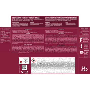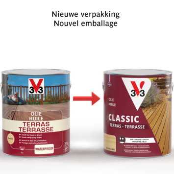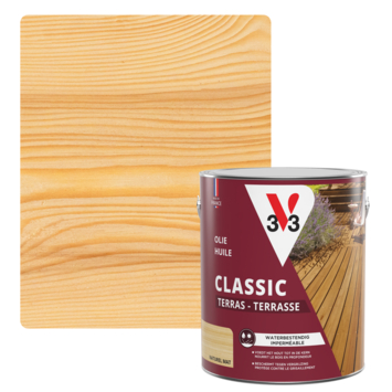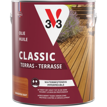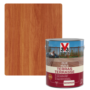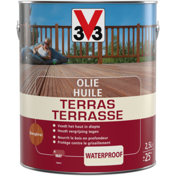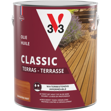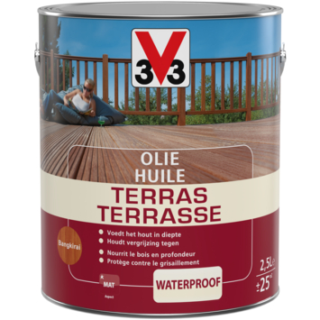 De V33 terrasolie, op basis van urethaan olie, is waterproof en voedt het hout in de diepte. Daarnaast houdt deze olie de vergrijzing van het hout tegen dankzij de actieve UV-filter. Deze olie met matte afwerking kan gebruikt worden op terrassen, tuintegels, etc. en is verkrijgbaar in 2 kleuren.