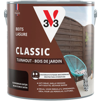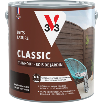 Met de V33 Tuinhout Classic beits zijdemat schorsbruin 2,5 liter bescherm je buitenhout op een praktische manier tegen weersinvloeden. Deze watergedragen beits is geschikt voor houten constructies zoals pergola’s, omheiningen, schommels, tuinschermen en bloembakken.