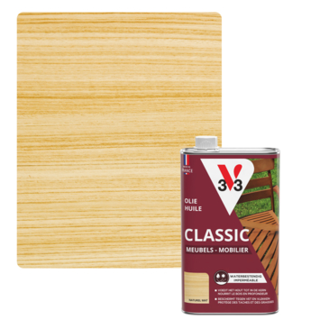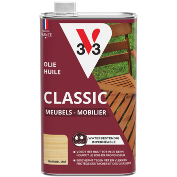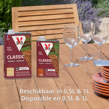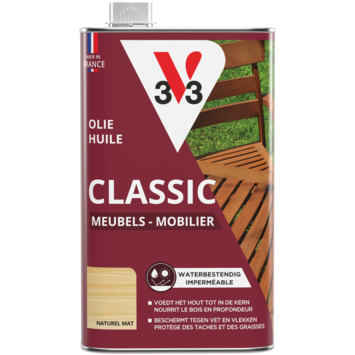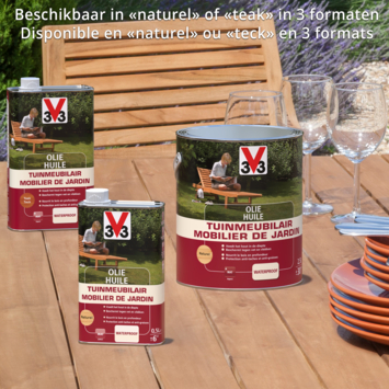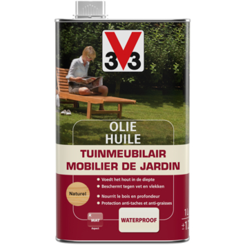 De V33 tuinmeubilair olie is bestand tegen water en voedt het hout. Bovendien beschermt de olie het hout op lange termijn tegen barre weersomstandigheden. De olie moet wel regelmatig gebruikt worden en is van toepassing op tuinmeubelen in teak of exotisch hout.