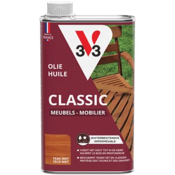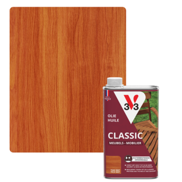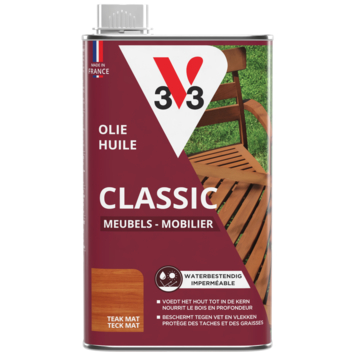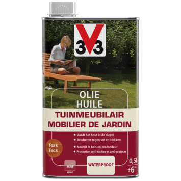De V33 tuinmeubilair olie is bestand tegen water en voedt het hout. Bovendien beschermt de olie het hout op lange termijn tegen barre weersomstandigheden. De olie moet wel regelmatig gebruikt worden en is van toepassing op tuinmeubelen in teak of exotisch hout.