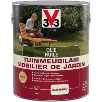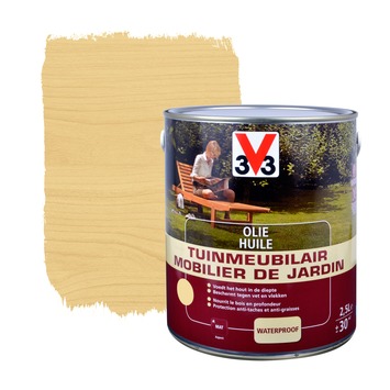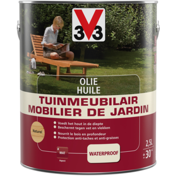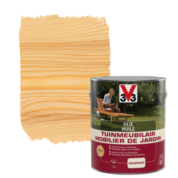 De V33 tuinmeubilair olie is bestand tegen water en voedt het hout. Bovendien beschermt de olie het hout op lange termijn tegen barre weersomstandigheden. De olie moet wel regelmatig gebruikt worden en is van toepassing op tuinmeubelen in teak of exotisch hout.