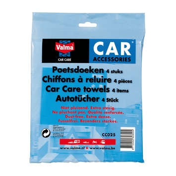 Met de Valma Poetsdoeken 4stuks poets je jouw auto in een mum van tijd. De sterke doeken pluizen niet, zodat ze direct en krachtig schoonmaken. Daarnaast laten de doeken na gebruik geen krassen achter. Eén verpakking van De Valma Poetsdoeken 4stuks bevat 4 poetsdoeken van ieder 21 bij 20 centimeter. Met de poetsdoeken maak je jouw hele auto schoon en wrijf je producten, zoals de Valma Wax, goed uit. Dit maakt de Valma Poetsdoeken 4stuks jouw ideale poetshulp.