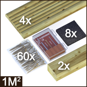 Het pakket bevat per 1 m²: 4x grenen vlonderplanken (1,9 x 14 x 240 cm), 2x grenen onderregels (4,4 x 6,8 x 240 cm), 10x rubber regeldragers (10 x 10 x 1 cm), en 60x vlonderschroeven. Let op: anti-worteldoek is niet inbegrepen, maar kan apart worden aangeschaft om onkruid te voorkomen. De planken zijn geschaafd en geimpregneerd voor een langere levensduur. De rubber regeldragers zorgen voor goede waterafvoer en ventilatie.