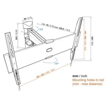 Deze draaibare TV steun komt slechts 7 cm van de wand. Deze TV steun is geschikt voor een platte LCD, LED en Plasma TV van 81cm tot 140cm of van 32" tot 55". Deze maten worden diagonaal gemeten. Het maximale gewicht van de TV is 30kg. Met deze TV steunen worden alle bevestigingsmaterialen meegeleverd. De maximale bevestigings maten van de TV zijn 400 x 400mm.