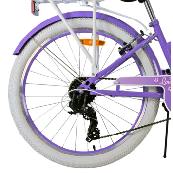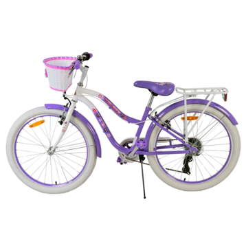 De Volare Lovely 24 inch kinderfiets is ideaal voor jonge fietsers die op zoek zijn naar een veilige en comfortabele fiets. Deze fiets in wit en paars heeft twee handremmen voor extra controle en 7 versnellingen voor een soepele rit, zowel op vlakke wegen als op heuvelachtig terrein. Reflectoren voor, achter en in de wielen zorgen voor een goede zichtbaarheid, terwijl de bel de veiligheid verder vergroot.