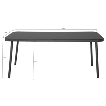 De eettafel heeft een hoogte van 75 cm, een breedte van 180 cm en een diepte van 90 cm.