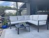 - Hoekloungebank, salontafel, zit- en rugkussens
