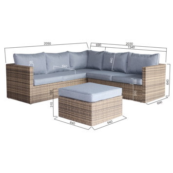 De Wakefield loungeset Torino in bruin biedt luxe en comfort voor je tuin of terras. Deze hoekbank is geschikt voor vijf personen en heeft afmetingen van 64 cm hoog, 208 cm breed en 208 cm diep, wat zorgt voor voldoende ruimte om te relaxen. Het metalen frame geeft de set een eigentijdse uitstraling en is tegelijkertijd zeer stevig. De grijze kussens, met een zitkussen van 10 cm dikte, bieden extra comfort voor lange uren buiten.