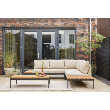 Dankzij de zachte beige kussens geniet je urenlang van gezellig samenzijn of pure ontspanning in de zon. De combinatie van natuurlijk teakhout en het strakke metalen onderstel geeft de set een moderne, maar warme uitstraling.