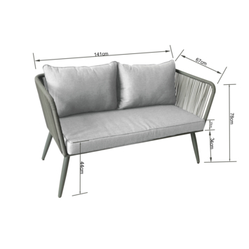 De tuinbank heeft een hoogte van 78 cm, een breedte van 141 cm en een diepte van 67 cm.