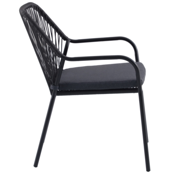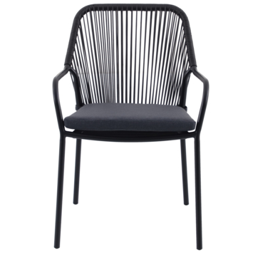 De Wakefield tuinstoel Split in zwart is ideaal voor wie op zoek is naar een comfortabele, betrouwbare en stijlvolle stoel voor zijn tuin of terras. De comfortabele zitting van zwart wicker en het zwart gecoate metalen frame zorgen voor een moderne en robuuste uitstraling. De meegeleverde zwarte kussens bieden extra comfort voor lange momenten van ontspanning.