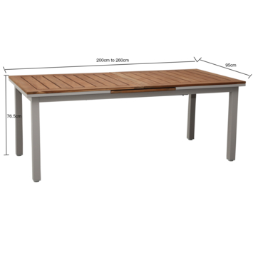 - Tafelblad 200 cm (uitschuifbaar tot 260 cm) x 95 cm, hoogte 76,5 cm