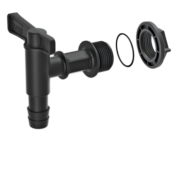 Kraan om opgevangen water in de regenwatertank af te voeren. De set bestaat uit 3 elementen: kraan; pakking; noot. Voorzien van een extra pakking en een moer, waardoor het compatibel is met alle Waterform regenwatertanks. Het uiteinde van de kraan is compatibel met de tuinslang
