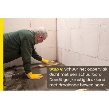 Heel handig spul: Makkelijk te verwerken, omdat het met water vermengd, de structuur van nat zand heeft. De volgende dag is het knoerthard en kun je er op lopen.