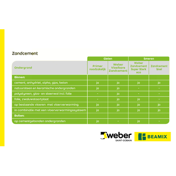 De Weber Beamix Chape solid eco 5kg is een kant-en-klare droge mortel die ideaal is voor het traditioneel smeren van dekvloeren of het leggen van tegels. Dankzij de 40% CO2-reductie ten opzichte van normaal zandcement biedt deze mortel niet alleen een sterke oplossing (C20/F4), maar ook een ecologische meerwaarde. Deze mortel is geschikt voor cementdekvloeren van 30 tot 50 mm en kan zowel binnen als buiten worden gebruikt, waardoor het een veelzijdige keuze is voor verschillende toepassingen.