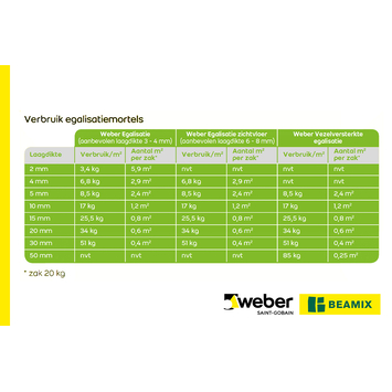 Met Weber Beamix egalisatie 20 kg creëer je eenvoudig de perfecte basis voor elke vloerafwerking, van tegels tot parket. Deze zelfnivellerende egalisatiemortel is ideaal voor het egaliseren van oppervlakken in laagdiktes van 1 tot 30 mm. Het cement is al na 4 uur beloopbaar, en na 24 uur kun je het verder afwerken met de vloerbedekking van je keuze. Dankzij de stofarme samenstelling en de grijze kleur is het een gebruiksvriendelijke oplossing voor zowel grote als kleine klussen.