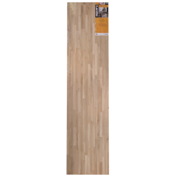 Een massief paneel helemaal gemaakt van echt hout met natuurlijke variëteit in kleur en uitstraling. Het houten meubelpaneel is te behandelen met een (blanke) lak, olie of verf. Het werkblad is toe te passen als aanrechtblad of als werkblad tegen de muur. Je kunt ook zelfs meubels maken met deze panelen of toe te passen als dikke boekenplank. Het massieve werkblad is opgebouwd uit eiken latten. Het paneel is rondom geschuurd en aan één lange zijde afgeschuind. Het hout is FSC gecertificeerd en daarmee afkomstig uit duurzaam beheerde bossen.
