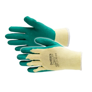 Handschoen met een groene latex coating op een polyester/katoen drager. Unieke groefstructuur voor superieure grip in droge en natte werkomstandigheden. Volledig naadloos. De handschoen is zeer slijtvast en heeft een hoge schuur- en scheurweerstand. Geschikt voor het manipuleren van bakstenen, dakpannen en alle handelingen waar zware arbeid verricht wordt.