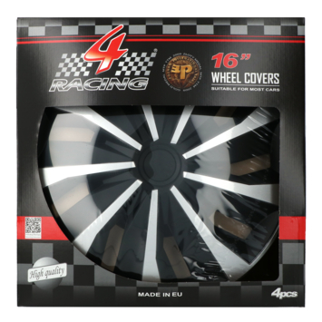 De zilverkleurige en zwarte Gorecki Grip 16 inch wieldoppen geven uw auto een