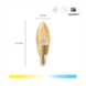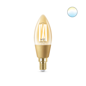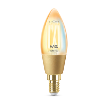 Met deze goudkleurige, kaarsvormige WiZ LED-filamentlamp heb je meteen sfeervolle slimme verlichting. Kies uit verschillende tinten warmwit tot koelwit licht, die je helpen ontspannen of juist concentreren. Stel timers in die je lampen automatisch in- of uitschakelen, gebaseerd op jouw dagritme. Bijvoorbeeld helder wit licht in de ochtend en zacht warm licht in de avond. Je kunt ze bedienen met je smartphone of stem, zelfs als je niet thuis bent. WiZ lampen werken op je eigen wifinetwerk. Meer heb je niet nodig. Deze lamp heeft een E14-fitting, en past dus in de meeste lampen met kleine fitting.