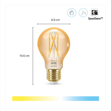 Breng gemakkelijk, slimme verlichting in huis. Deze goudkeurige WiZ LED-filamentlamp geeft sfeervol warm- en koelwit licht dat je helpt met ontspannen of juist concentreren. Je kunt timers instellen die je lampen automatisch in- of uitschakelen, gebaseerd op jouw dagritme. Bijvoorbeeld helder wit licht in de ochtend en zacht warm licht in de avond. Je kunt ze bedienen met je smartphone of stem, zelfs als je niet thuis bent. WiZ lampen werken op je eigen wifinetwerk. Meer heb je niet nodig. Deze peervormige lamp heeft een E27-fitting, en past dus in de meeste lampen met grote fitting.