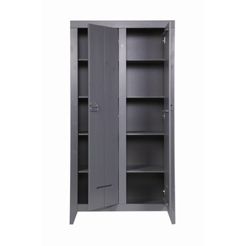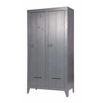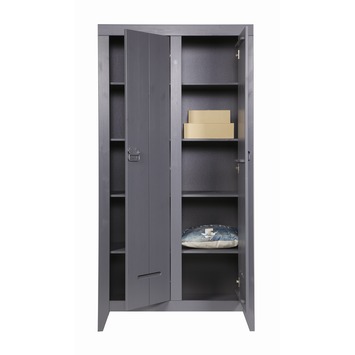 De WOOOD wandkast Kluis, afmetingen (hxbxd) 190x95x44 cm, zit vol legplanken en heeft twee deuren met stoere metalen grepen en solide metalen scharnieren. Deze opberger uit de collectie van WOOOD, is gemaakt van massief grenen, gelakt in de kleur staalgrijs en heeft een geborstelde afwerking. Bij het borstelen van grenen meubelen wordt de nerf sterk geaccentueerd en ontstaat een doorleefd oppervlak. De kast is voorzien van 4 gemelamineerde spaanplaat legplanken (dus 5 opbergvakken) achter elke deur en past in elke ruimte: de kinderkamer, de woonkamer en/of de studeerkamer.De wandkast Kluis is ook in de kleur betongrijs gelakt verkrijgbaar. Deze kast wordt als bouwpakket geleverd en is makkelijk te monteren met behulp van de bijgeleverde montage instructie.