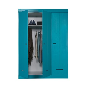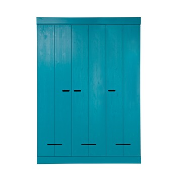 Wie van lockers houdt, houdt van deze petrolkleurige lockkast van Woood. De Lock kast heeft 3 grote deuren, waarachter je heel wat kledij kwijt kan: aan de roede of op de legplanken. De kast is gemaakt uit massief grenen en heeft een verticale V-groef, wat voor een landelijke uitstraling zorgt. Je kan de kast uitbreiden met een andere Lock kast van 3 of 2 deuren en een interieurpakket met een tussenschot en 3 legplanken.