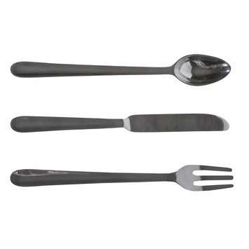 Eten doe je niet met deze metalen bestekset, decoreren wel. De stijlvolle set bestaat uit een mes, een vork en een lepel die je tegen de muur van je keuken of eetkamer kan hangen. Decoratie met een knipoog, enkel voor hobbykoks en levensgenieters.