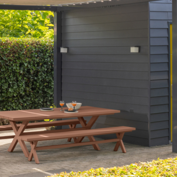 Wil je de tafel beschermen tegen regen en vorst? Dan is het aan te raden om een beschermhoes te gebruiken of de tafel in de wintermaanden binnen te zetten. De Delta picknicktafel wordt geleverd in één pakket en is eenvoudig te monteren. Voeg een paar mooie zitbanken toe en creëer een gezellige plek om te genieten van het buitenleven.