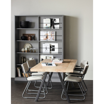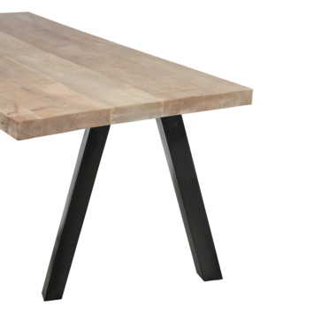 Deze mangohouten Tablo tafel heeft een lengte van 180 cm en een breedte van 90 cm, zodat je er gemakkelijk met 6-8 personen aan kunt zitten. Het blad is 5,5 cm dik. Het mango hout is afgewerkt met een lime wash finish, waardoor het mango hout een soort white wash laagje krijgt. Deze afwerking verbetert de algehele uitstraling van het hout en benadrukt tegelijkertijd de schoonheid van de houtnerf. Het tafelblad heeft hierdoor een stoer en robuust uiterlijk met een lichte uitstraling.