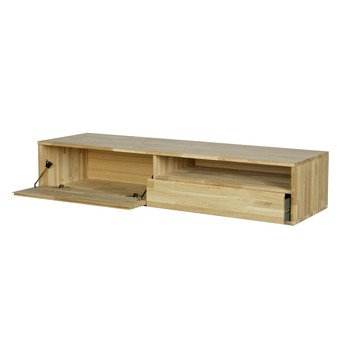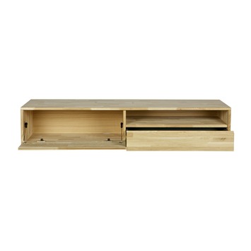 Het Tygo tv-meubel van Woood is verkrijgbaar als hangend meubel of staand meubel, maar steeds gemaakt uit onbehandelde eik met een vintage uitstraling. Over de indeling van het meubel is goed nagedacht. De kast beschikt over een grote lade, een kleinere schuif en een open vak. In elk van de 3 compartimenten kan je wel iets anders kwijt: je dvd's, je kabels, ... Praktisch én prachtig! Tip: het model op de foto is geschikt om aan de muur te hangen.