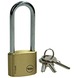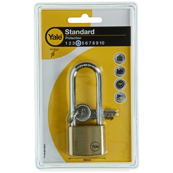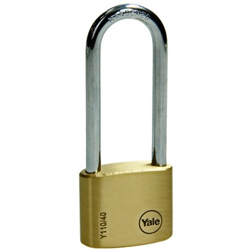 Yale 40 mm messing hangslot met verchroomd stalen lange beugel voor algemeen gebruik. Sluiten door dicht te klikken en te openen met sleutel, gelijksluitend. Met dubbele vergrendeling voor extra veiligheid. Inclusief 3 sleutels. Type Y110/40/163/1