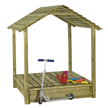 De zandbak met deksel & dak is 134 op 140 centimeter groot en maar liefst 154 centimeter hoog. Als fundamentmaat heeft de zandbak 120x120 centimeter. Hij bestaat uit een bak met een dubbel deksel dat je kan openklappen en een dak, zodat je kids ook bij regen in het zand kunnen spelen. Gemaakt uit geïmpregneerd grenen.