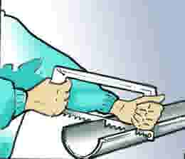 Meet het laatste stuk van de dakgoot af en markeer de nodige lengte met een stift of tape. Zaag vervolgens het overtollige deel van de dakgoot weg met behulp van een ijzerzaag. Begin het zagen vanaf de onderkant van de dakgoot. Nadat je het stuk hebt afgezaagd, klik je het eindstuk met uitloop aan het uiteinde van dakgoot vast. Het andere uiteinde wordt afgewerkt met eindstuk zonder uitloop.