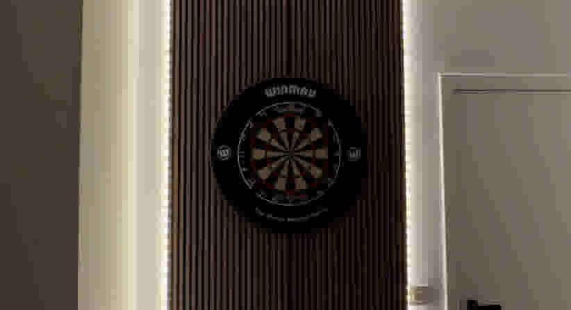 Een standaard dartboard met surround is ongeveer 45–50 cm in diameter. Voor extra bescherming en ruimte voor LED-strips reken je 10–15 cm extra aan elke kant. De Lattenwand Melbourne is 260 cm hoog en 52 cm breed. Eén paneel kan nét, maar voor extra buffer en verlichting is het handiger om twee panelen naast elkaar te gebruiken.